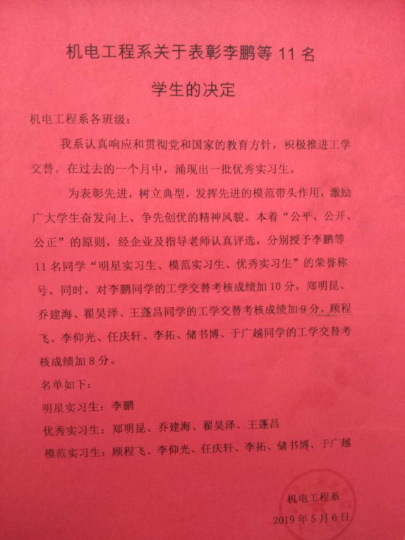 为表彰先进,树立典型,发挥先进的模范带头作用,激励广大学生奋发向上、争先创优的精神风貌,本着“公平、公开、公正”的原则,经企业及指导老师认真评选,分别授予李鹏等11名同学“明星实习生、模范实习生、优秀实习生”的荣誉称号。同时,分别对这11名学生的工学交替考核进行相应加分。