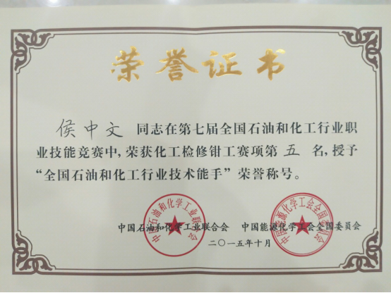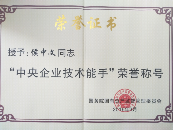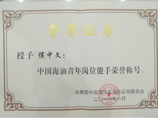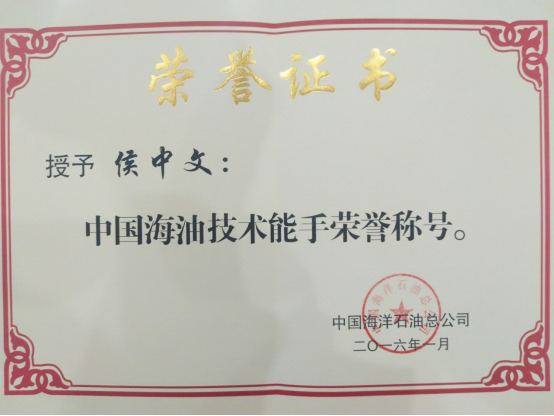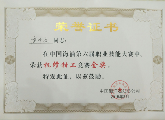 十年来,侯中文始终扎根检修一线,苦练基本功,先后赢得多项殊荣。2012年、2015年两次获得全国石油和化工行业职业技能竞赛银奖,被授予“全国石油和化工行业技术能手”荣誉称号;2015年获得中国海油集团公司职工技能大赛金奖;2016年,分别荣获 “中国海油技术能手”和“中国海油青年岗位能手”荣誉称号;2016年3月,被授予侯中文“中央企业技术能手”荣誉称号。
