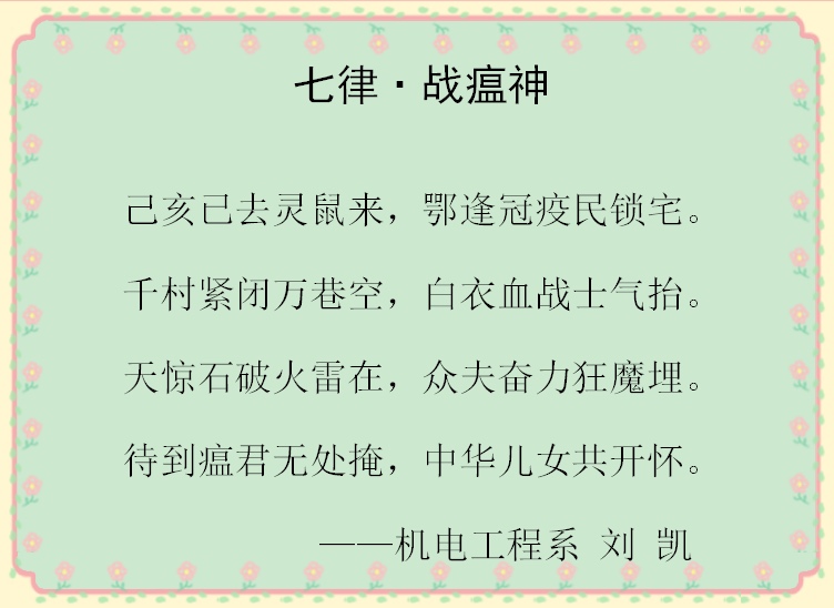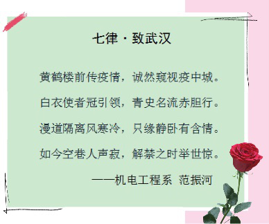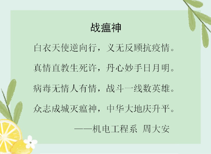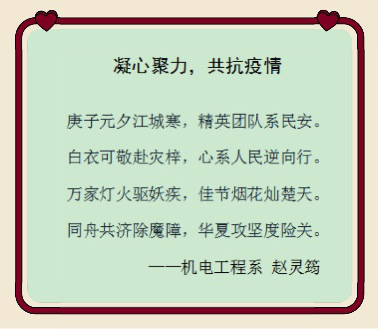 山东化工职业学机电工程系心系武汉,积极响应学校号召。应校宣传部征集要求,向广大师生征集反映抗击疫情的文学文艺作品,共收到系部10位老师的12个作品。其中诗歌类9个,书法美术类1个,舞蹈短视频1个,海报类作品1个。