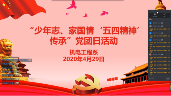 机电工程系党支部与团总支运结合习近平总书记给北京大学援鄂医疗队全体“90后”党员的回信精神,4 月 22 日习近平总书记考察西安时提出的“西迁精神”等系列精神,开展一次线上主题党团日活动,引导学生进一步明确新时代中国青年的责任与担当,切实将爱国主义教育推向深入。4月29日,机电工程系党支部与团总支在赵杨老师的带领下开展线上少年志、家国情“五四精神”传承为主题的党日学习活动。