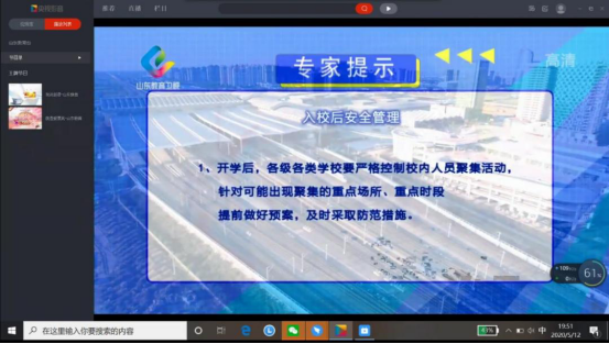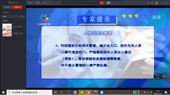 为切实做好学生开学返校和疫情防控工作,维护好师生生命安全和身体健康,引导全省广大师生、家长树立科学防控意识,山东省教育厅、山东教育电视台策划制作了《新课堂——同心战“疫”特别节目》。为返校做好准备,山东化工职业学院机电工程系组织全体教职工、学生及家长共同收看了此次节目。