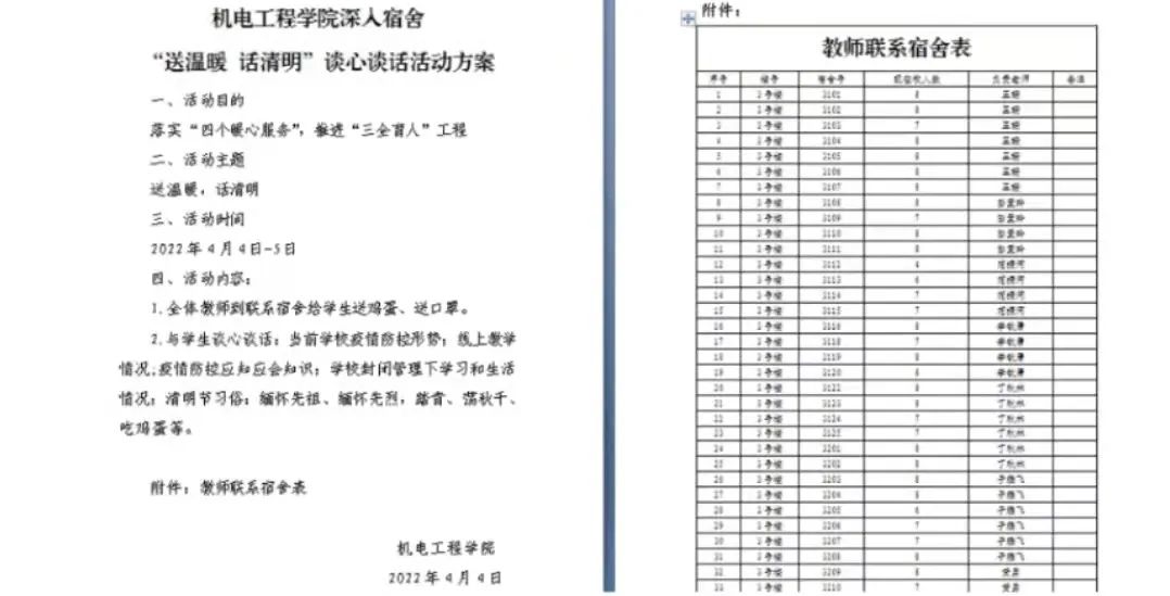 为落实学校“四个暖心服务”,推进“三全育人”工程,学院制定了《机电工程学院深入宿舍“送温暖话清明”谈心谈话活动方案》。清明节前夕,41名教师包靠宿舍,深入241个学生宿舍与学生们交心谈话,为学生们送鸡蛋,给同学们的晚饭加“营养”,把学校领导对学生的关心、关爱传递给每一个学生。