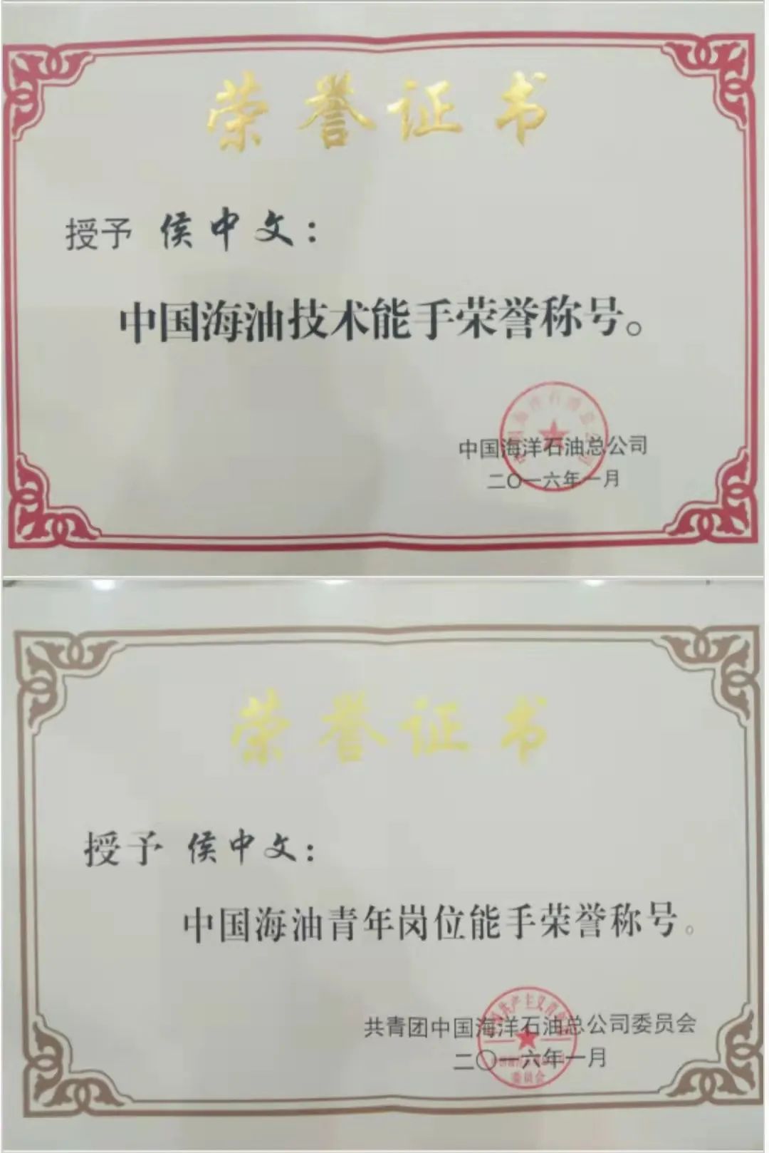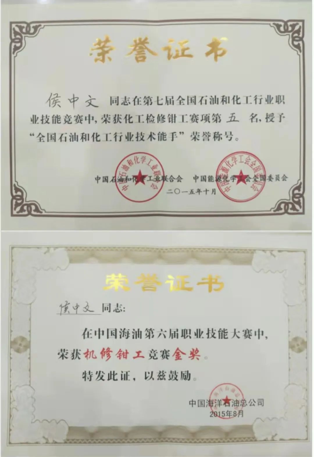 十多年来,侯中文始终扎根检修一线,苦练基本功,先后赢得多项殊荣。2012年、2015年两次获得全国石油和化工行业职业技能竞赛银奖,被授予“全国石油和化工行业技术能手”荣誉称号;2015年获得中国海油集团公司职工技能大赛金奖;2016年,分别荣获 “中国海油技术能手”和“中国海油青年岗位能手”荣誉称号;2016年3月,被授予“中央企业技术能手”荣誉称号,全国石油和北工行业职业技能竞赛银奖,中国海油职工技能大赛金奖等多个大奖并被授子“全国石油和化工行业技术能手”“中国海油技术能手”“中国海油青年岗位能手”中央企业技术能手”海省“南海工匠”等多项荣誉。
