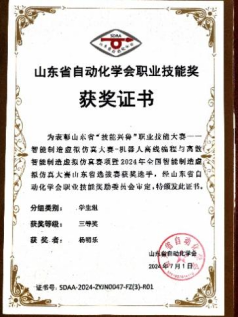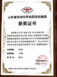 本次大赛分为理论考核和实操考核两部分。理论部分考核工业机器人技术、PLC应用技术、电工电子技术等专业理论知识。实操部分考核工业机器人离线编程软件PQ Factory完成集成系统虚拟搭建、工艺流程规划、工业机器人虚拟编程与调试、MES系统调测等,要求选手具备扎实的理论基础和实际操作能力,以及对智能制造领域的深刻理解和创新思维。在李尧、杨云飞、王宏甲老师前期的精心指导下,参赛学生凭借着扎实的专业知识和技能水平获得优异成绩。其中,张新峰、王晨阳同学获得二等奖,蒋冬玉、杜忻航、张纪栋、杨明乐同学获得三等奖。