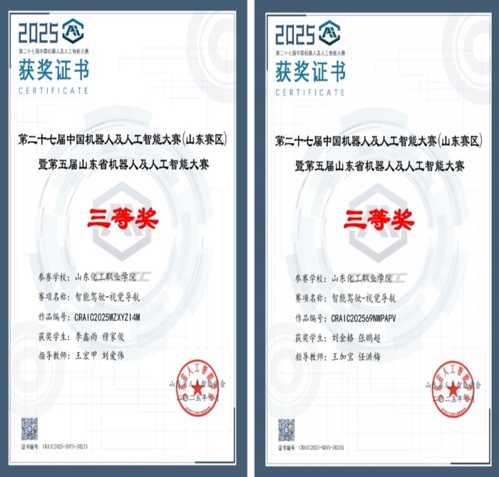 近日,第二十七届中国机器人及人工智能大赛(山东赛区)暨第五届山东省机器人及人工智能大赛落下帷幕,来自全省本专科高校的近1000支队伍,4000余名师生参赛,我校机电工程学院8名学子组成4支队伍参加“智能驾驶-视觉导航”比赛 ,经过2个月的艰苦备战,突破重重技术难关,最终获得二等奖2项,三等奖2项的优异成绩,其中二等奖2支队伍晋级国赛,展现了我校学子扎实的专业素质和卓越的创新能力。