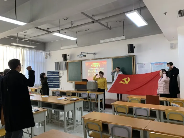 随后,由支部党员王珊同志领誓,全体党员重温了入党誓词,在思想上再一次经受“洗礼”。全体党员佩戴党员徽章,面对党旗,高举右手,重新体会当初入党时激动的心情。
